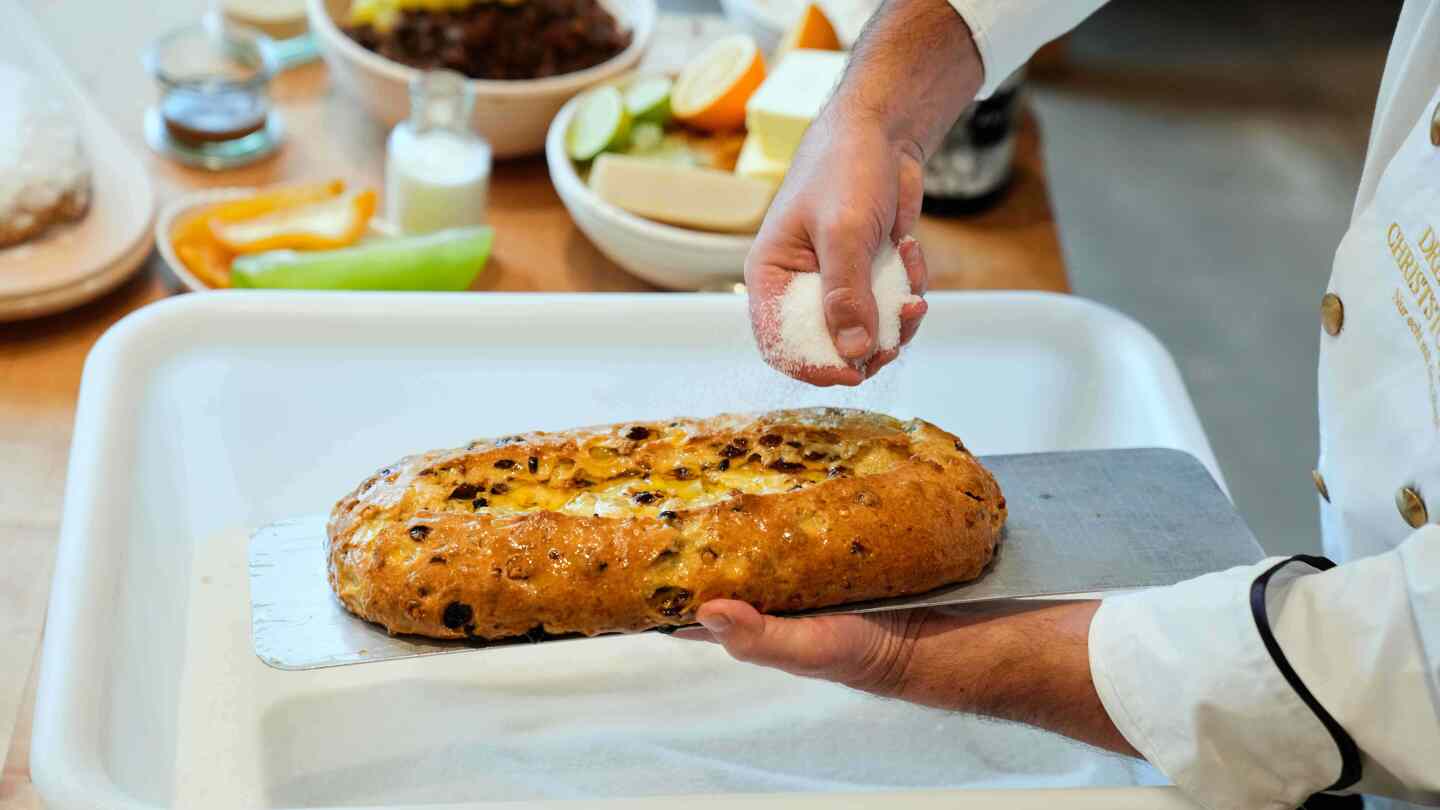 After baking several loaves of stollen in his Dresden bakery in November, Gierig picked off some slightly burned raisins from the top, brushed the pastry with butter, sprinkled granulated sugar on top, and in a final touch dusted it with powdered sugar.