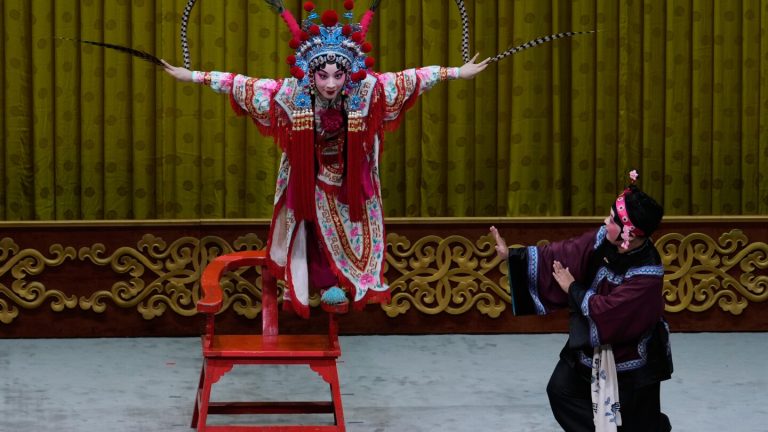 BEIJING (AP) — Dressed in a red-and-white warrior costume, Peking opera actress Zhang Wanting balances on one foot on the narrow handle of a rosewood chair. She bends forward, lifts her other leg high and grasps the two long pheasant plumes on her helmet to strike a pose like a flying swallow.
