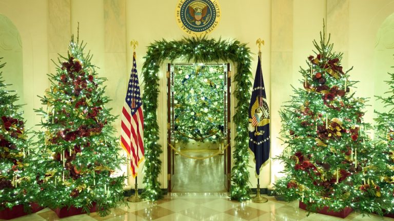 In a change this year because the East Wing was torn down, the official White House Christmas tree, which is always on display in the Blue Room, also honors Gold Star families, those that lost a member during active-duty military service.