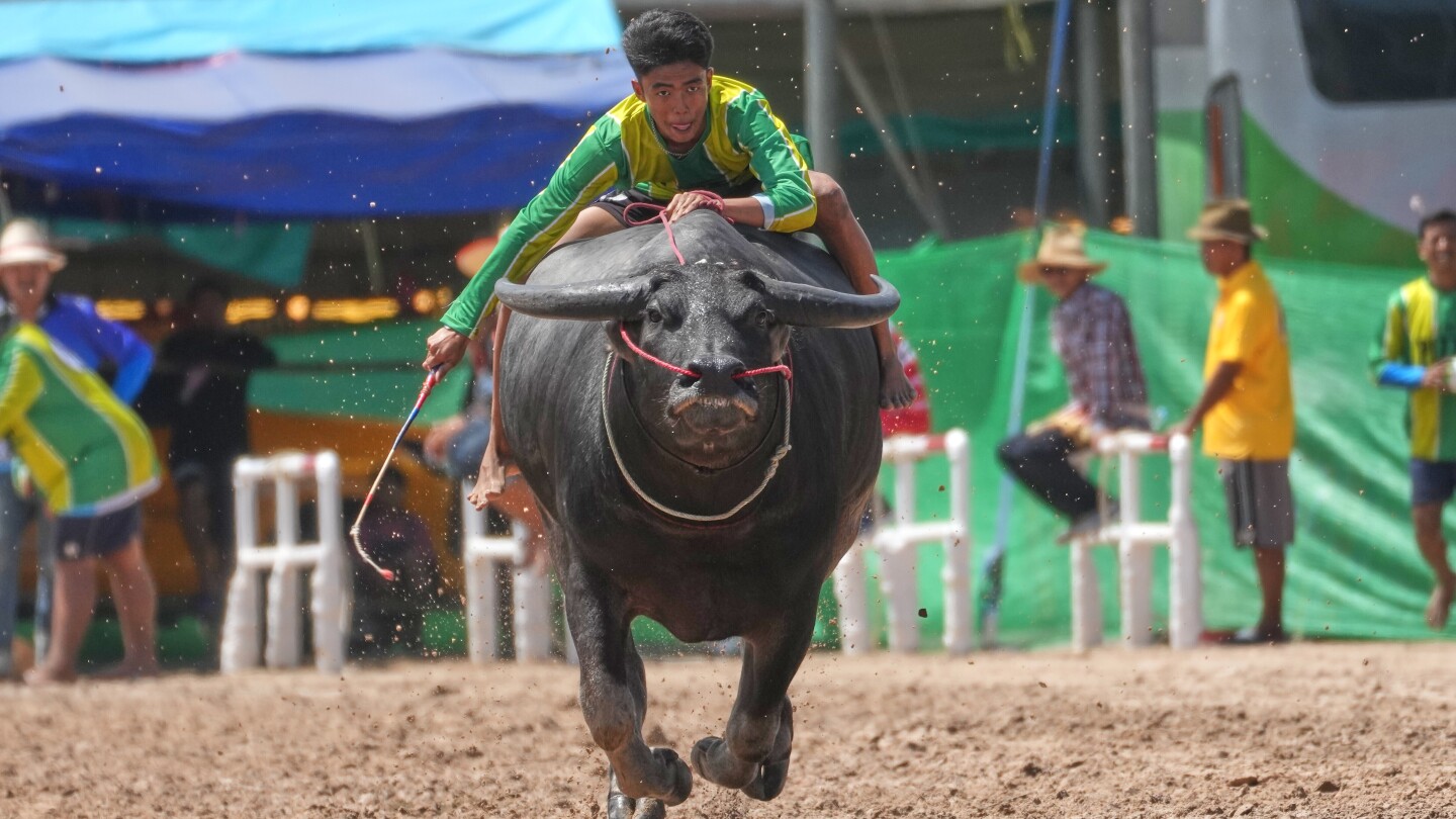 Photos show a water buffalo festival in Thailand at the start of harvest season