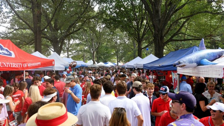 It’s hours before kickoff. Ole Miss is hosting LSU in its biggest game of the season so far, and tens of thousands of fans gather at The Grove, a 10-acre plot in the center of campus surrounded by oak trees. The grassy area has transformed into a sea of red and blue tents decked out with chandeliers and elaborate spreads.
